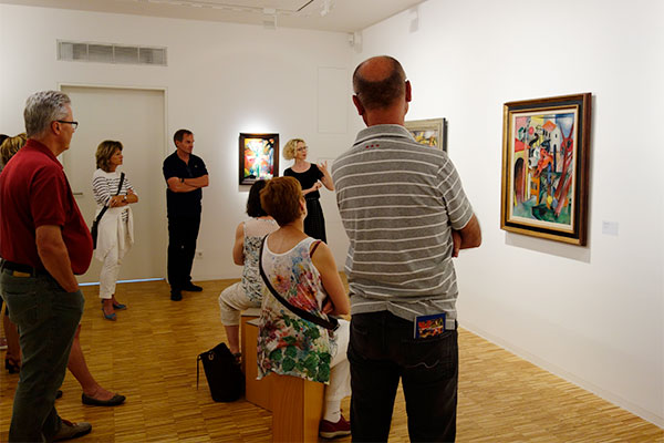 Im hohen Foyer des Museum hängt eine Installation, die die Farben Schwarz und Gelb verwendet. Die Ränder der Scheiben schimmern durch die Lichtbrechung hell auf. Das erinnert mich an Kohle und Schwefel. DrinnenNachdem ein Café genommen war, betraten wir die Ausstellungsräume. Unsere kundige Führerin erläuterte uns die Werke und deren Bezug zum Leben des Künstlers. Da ich selbst zu Campendonk, auch aus der zeitlichen Distanz zu unserer Fahrt, nicht viel sagen kann, möchte ich einfach die Photographien sprechen lassen, die ich dort gemacht habe: |
