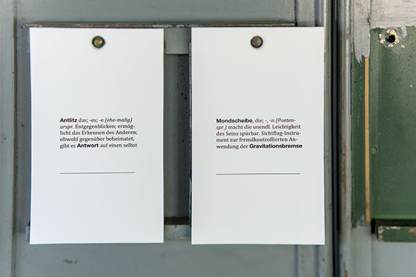 >> Einführung zur Ausstellungseröffnung, von Hans Peter Schöler (PDF) >> Gedanken zu "Duden dichten" von Günter Nosch (PDF) >> Gedanken zur Schrift Calibri von Günter Nosch (PDF)