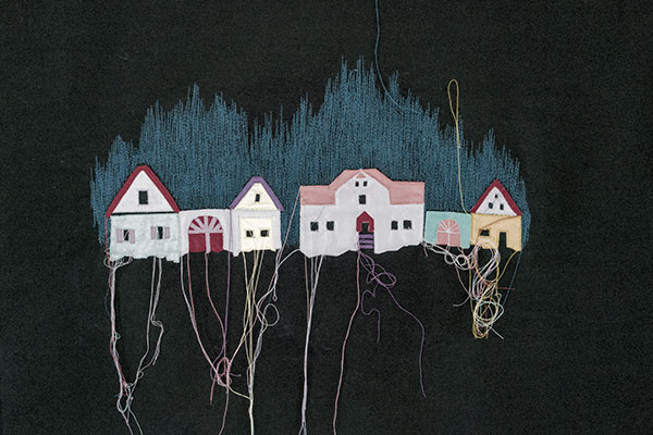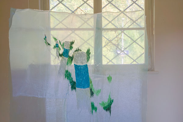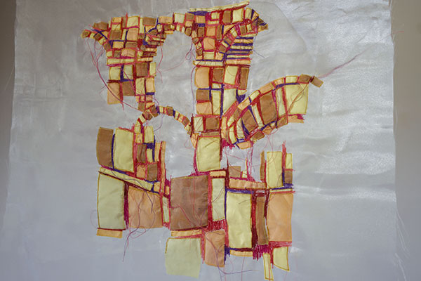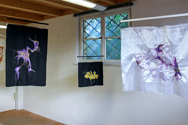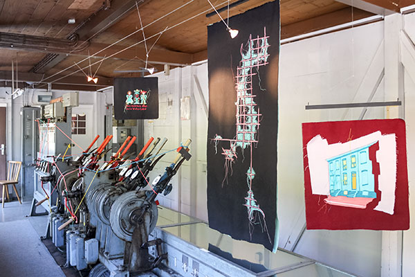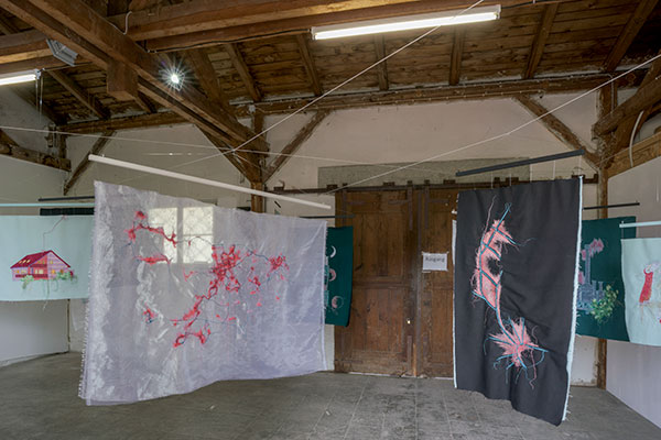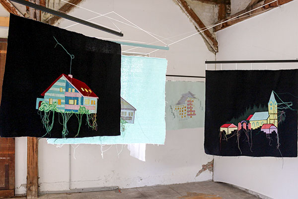 Genähte Bilder, die von Wanderern zwischen den Gesellschaften erzählen Rauminstallation