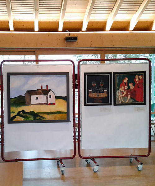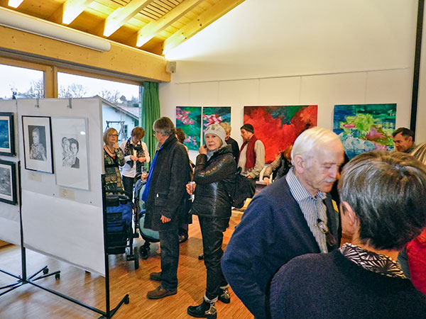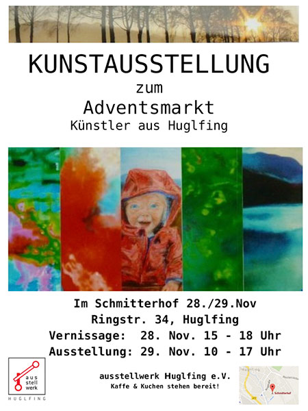 Wie vom Verein angekündigt, fand die Ausstellung durch Vereinskünstlerinnen und -künstler für den Adventsmarkt in Huglfing (am 28.11.2015 von 15:00 bis 18:00 Uhr und am 29.11.2015 von 10:00 Uhr bis 17:00 Uhr) statt. Mit dieser Ausstellung hat der Verein den Künstlern Huglfings und den Mitglieder des Vereins, sowie den Besuchern eine Plattform der Begegnung geboten. Zur Vernissage war der Andrang erfreulich hoch und auch am folgenden Tag kamen noch viele Besucher. Manch einer stattete einen Besuch ab, der zuvor den Adventsmarkt vor dem Rathaus besucht hatte. Es wurde sogar verkauft! Die Ausstellungsorganisation hat freundlicher Weise Frau HeideKarin Konwalinka mit Unterstützung des Vereins übernommen. Während der Mitgliederversammlung vom 19.11.2015 hatte Frau Konwalinka mitgeteilt, dass sechs Bewerbungen eingingen und natürlich auch sechs KünstlerInnen ausstellen würden. Am Sonntag wurde Kaffee und Kuchen gereicht, zur Vernissage gab es herzhafte Snacks. Durch Ihre Spenden und den Einnahmen aus dem Kuchenverkauf haben Sie den Verein ein Stück weit unterstützt. Herzlichen Dank dafür! Unten finden Sie noch das Plakat und ein paar Photographien. |