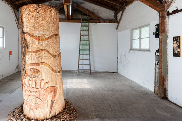 Und was sind heute unsere Dämonen? Die böse gewordenen Geister sind übergegangen in die psychologische Dimension. Keine Wesen, sondern Ängste fassen uns. Unheimlich tauchen sie immer wieder auf, gleichwohl wir sie zu meiden suchen, verwandelt, gewandelt, aber leugnen können wir sie nicht. Sie begleiten uns meist ein Leben lang. Am Baumstamm in der Lagerhalle stoßen Sie auf diese Dämonen, in den Bildern ebenso. Was ging alles über den einhundert Jahre alten Baum hin? Wie ging die Geschichte durch ihn hindurch und welche Dämonen streiften ihn angesichts der Menschen, die ihn umstanden und berührten?