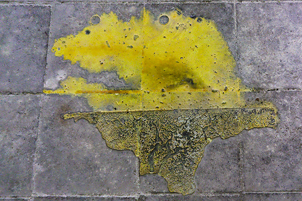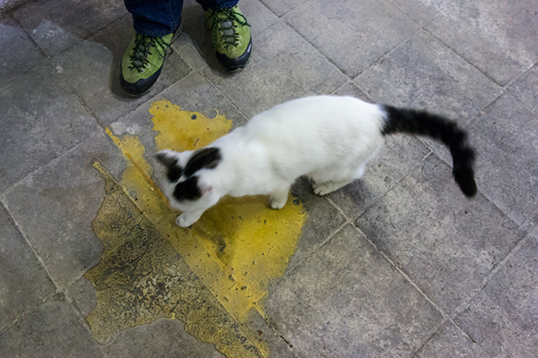 Während ich derart kühl saß, vernahm ich plötzlich ein leises Geräusch, als wäre Sand sacht über den Steinboden gerieben worden, ganz wie ein heiseres, feines Flüstern, etwas zwischen Wolle und rauem, grauem Stein. Zuerst nahm ich nicht recht Notiz, als es sich aber wiederholte, wurde ich neugierig. Bockkäfer im Gebälk konnten es nicht sein. Fehlerhafte Elektroinstallationen genauso wenig. Auch strich niemand vor den Bildern umher, ich wähnte mich alleine. Da, ich hörte es wieder, dieses verhaltene Huschen. Ich erhob mich geräuschlos, schritt langsam diesem Laut entgegen und fand meinen Gast vor mir auf dem Boden. Zum Bild hatte es der kleine Interessent wirklich nicht mehr weit. Sehen sie selbst, als ich ihn sah, rührte er sich nicht.