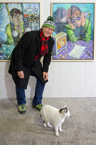 Kaum hatte ich mich über meinen Fund gefasst und den Eindruck gewonnen, dass es sich hier um ein phänomenales, gattungsübergreifendes Kunstinteresse handeln musste (wie lange hatte er auf dieses Ereignis dort schon gewartet?!), schon kam der nächste zur Tür herein und wählte den ersten Platz im Parkett. Er sah dezent nach links und nach rechts, als wären die Bilder nicht so recht von Interesse, aber er versuchte mich zu täuschen, er war ein echter Aficionado! Bild für Bild wurde sorgfältig taxiert und schlussendlich trat er an sie heran, als wolle er den Duft der Materialien aufnehmen und die Struktur des Farbauftrags geistig kartographieren.